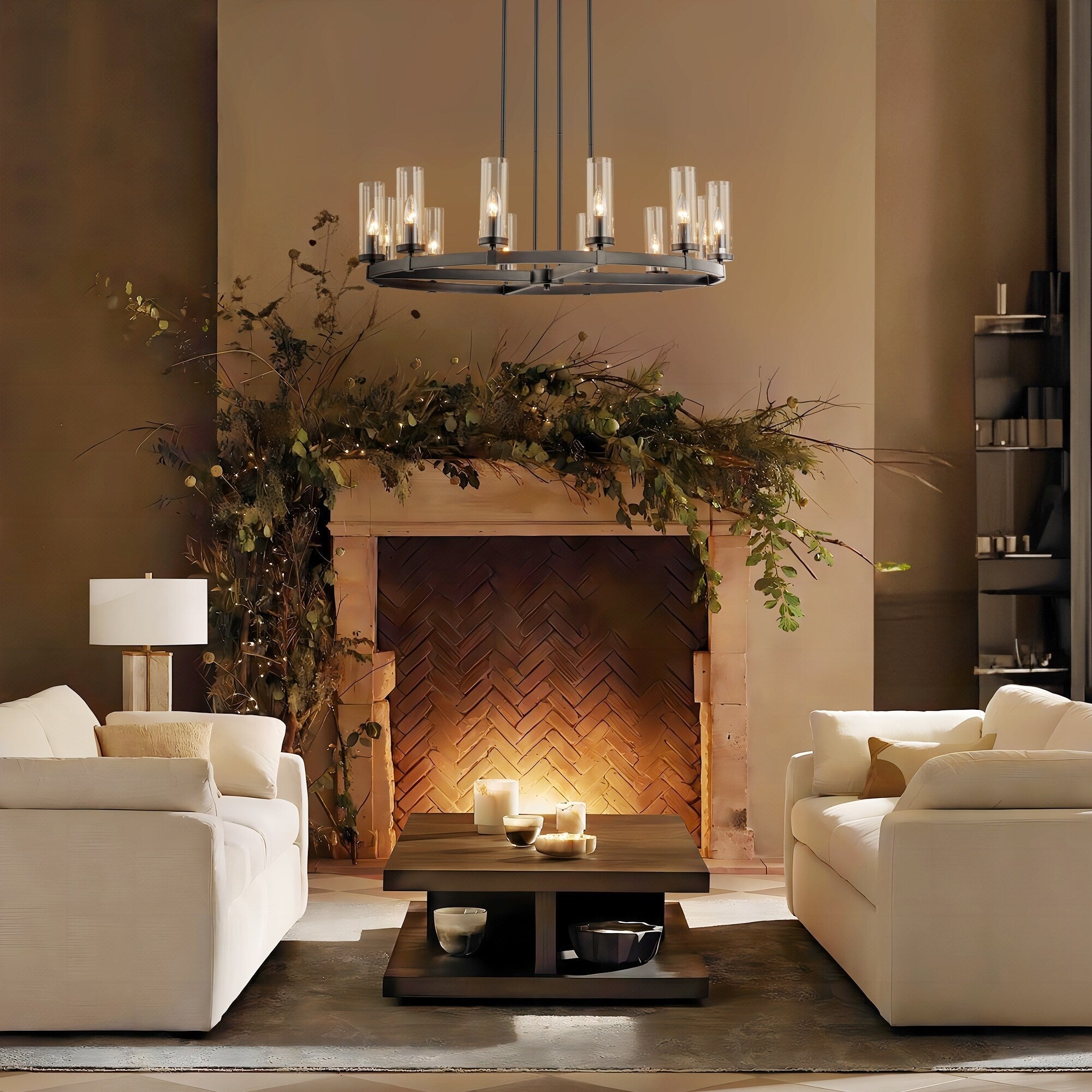 Ce lustre rétro industriel circulaire en forme de roue de chariot à 12 lumières, en verre transparent, d'un diamètre de 90 cm, témoigne d'un savoir-faire artisanal et d'une ingéniosité de conception inégalés. La lumière traverse l'abat-jour en verre transparent et diffuse une lumière douce et généreuse, projetant une aura lumineuse qui enveloppe gracieusement votre espace de vie. Ce luminaire opulent présente un cadre distinctif en forme de roue et d'élégantes ampoules cylindriques de style chandelier (non fournies), dégageant une présence imposante et une esthétique industrielle vintage prononcée.