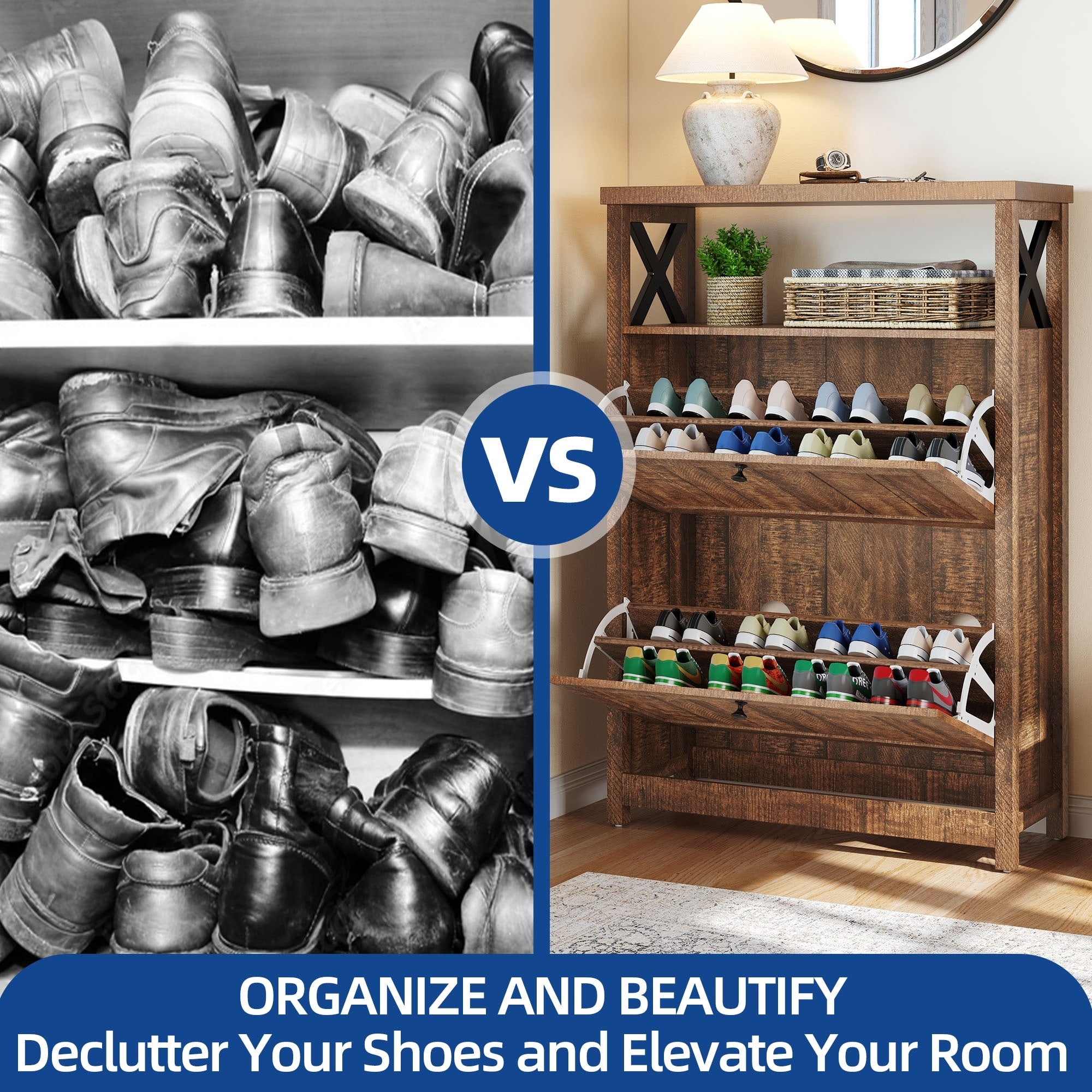 • L'armoire à chaussures élancée avec une finition blanc chaud maximise l'espace et élimine l'encombrement.