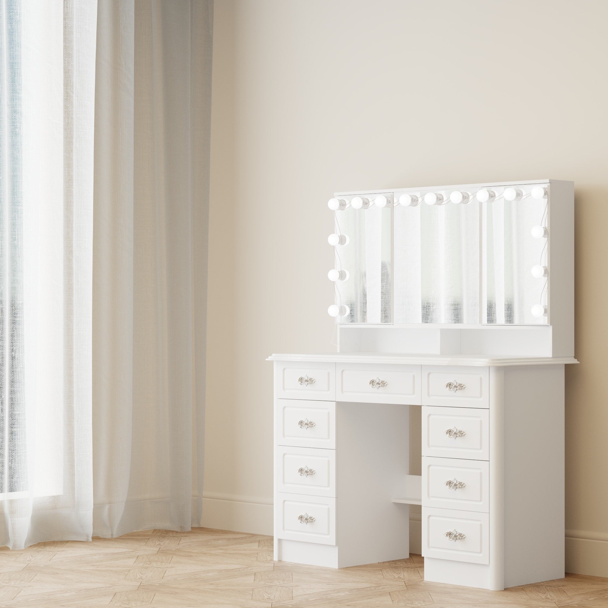 Coiffeuse blanche élégante avec miroir à trois volets et éclairage réglable
